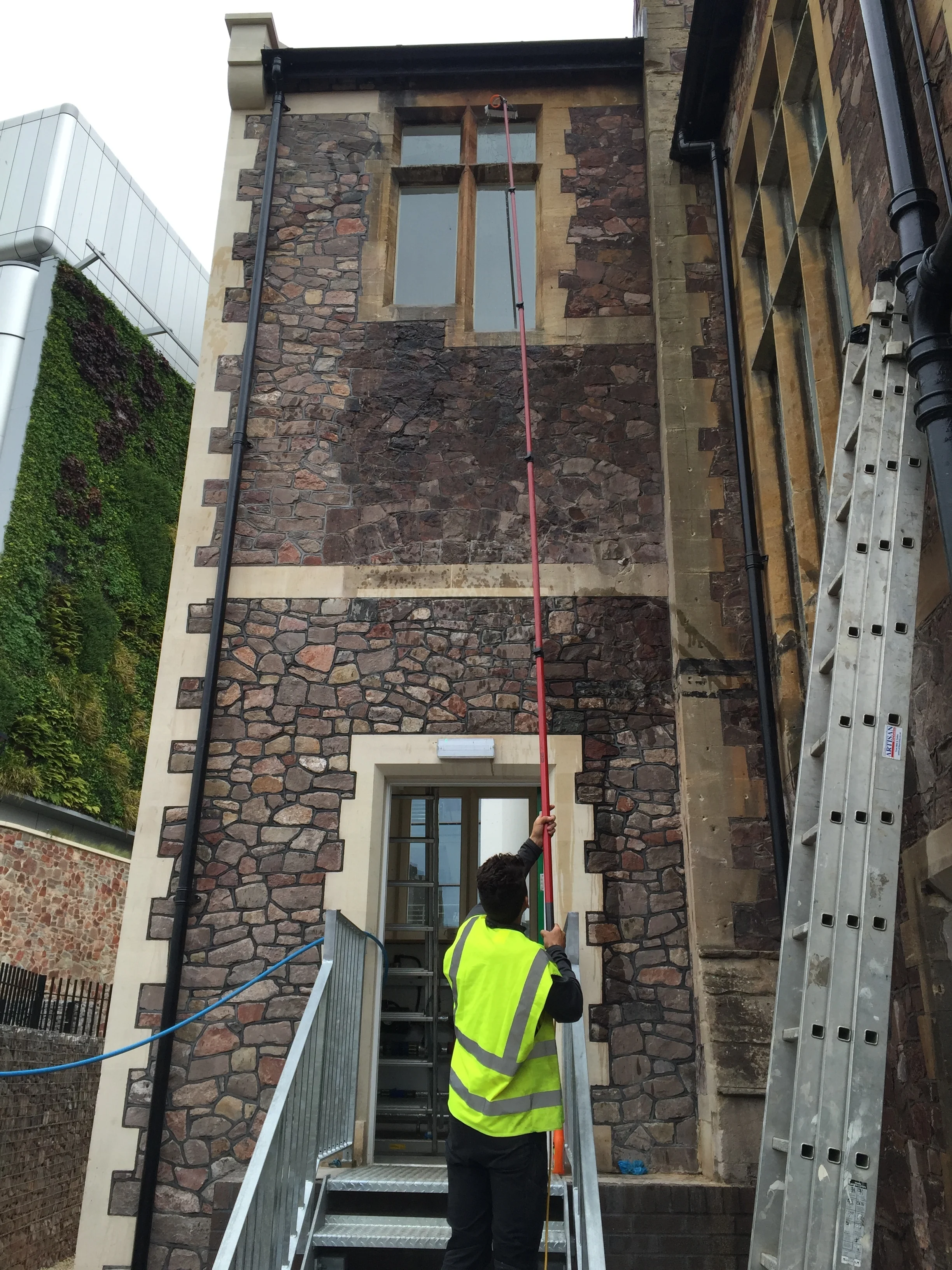 We use the latest in water Fed Pole technology up to 60ft as a safer alternative to using ladders. This ladder-less system means that there are no privacy issues, no damage from ladders being placed against walls or windows, and of course there is no disturbance to staff.